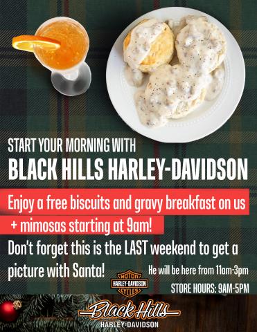 Black Hills HD is hosting a free biscuits and gravy breakfast on Saturday, December 20 from 9am to 5pm. Mimosas starting at 9. Last chance to get a picture with Santa